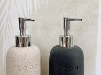 Juego de baño en color blanco. Compuesto de dosificador, vaso y bandeja.