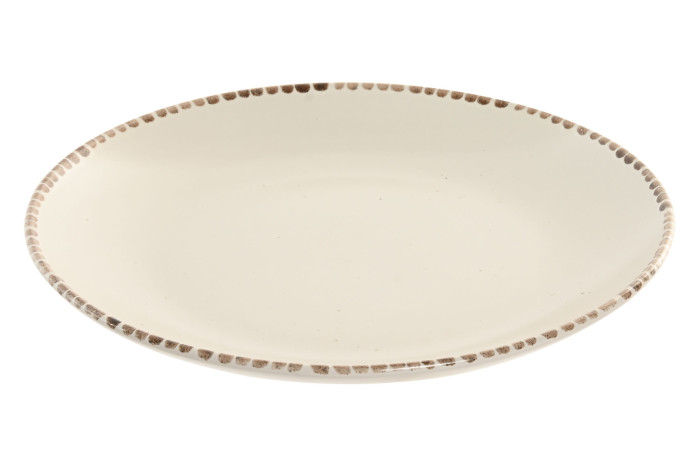 Vajilla en tonos beige, 6 platos hondos, 6 platos llanos y 6 platos de postre.