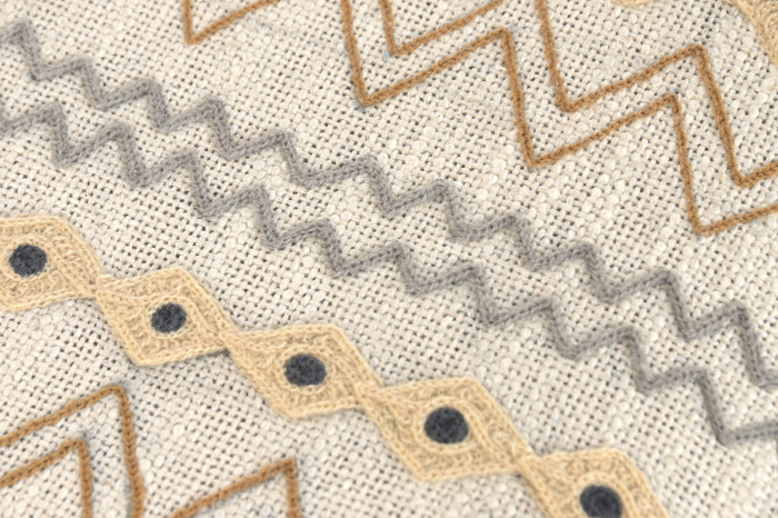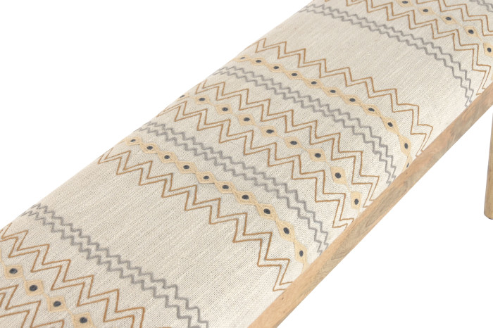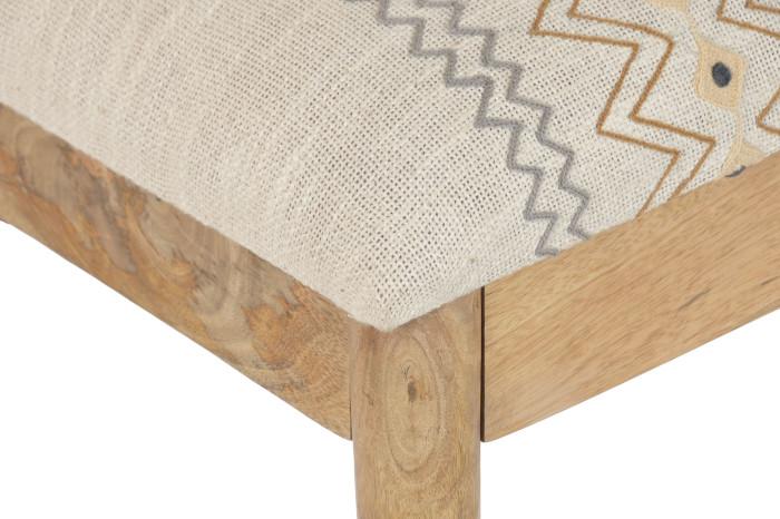 Descalzadora estampado geométrico bordado, patas en madera natural.